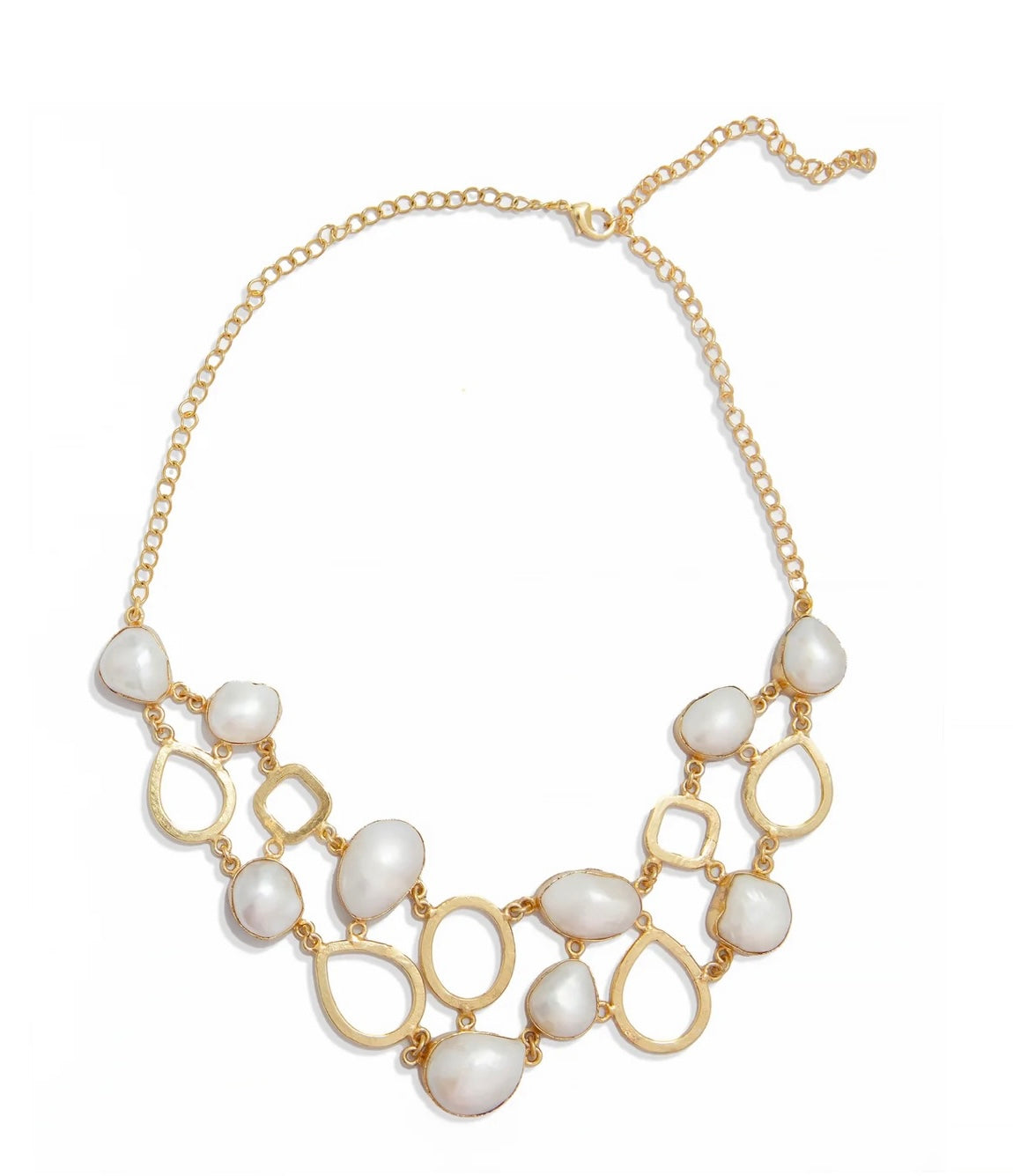 A stunning statement piece with a design inspired by a beehive's ingenious geometry. Made with freshwater pearls and handmade brass.