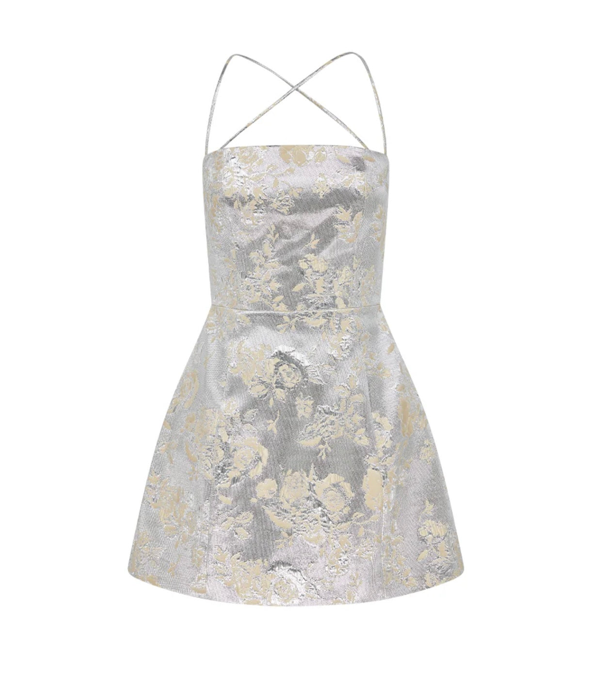 A MANNING CARTELL archival style reimagined for today, the Precious Metal Mini Dress blends structured elegance with a modern edge. The fitted bodice features a straight neckline, flowing into a shaped A-line skirt for a flattering silhouette. At the back, fine rouleau straps cross over an open design, adding delicate detail and contemporary allure. Cut from French metallic jacquard, it shimmers with every movement. This mini brings elevated elegance to any occasion.