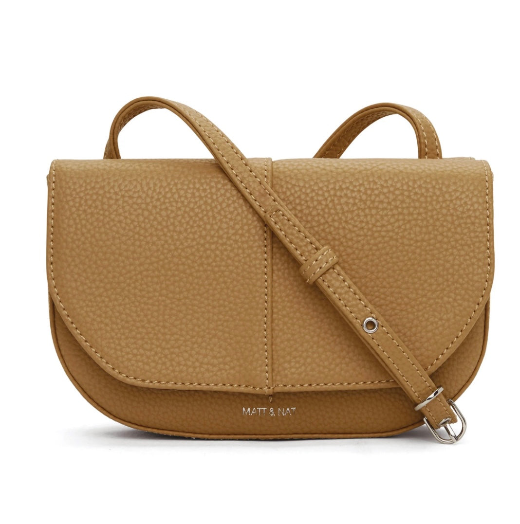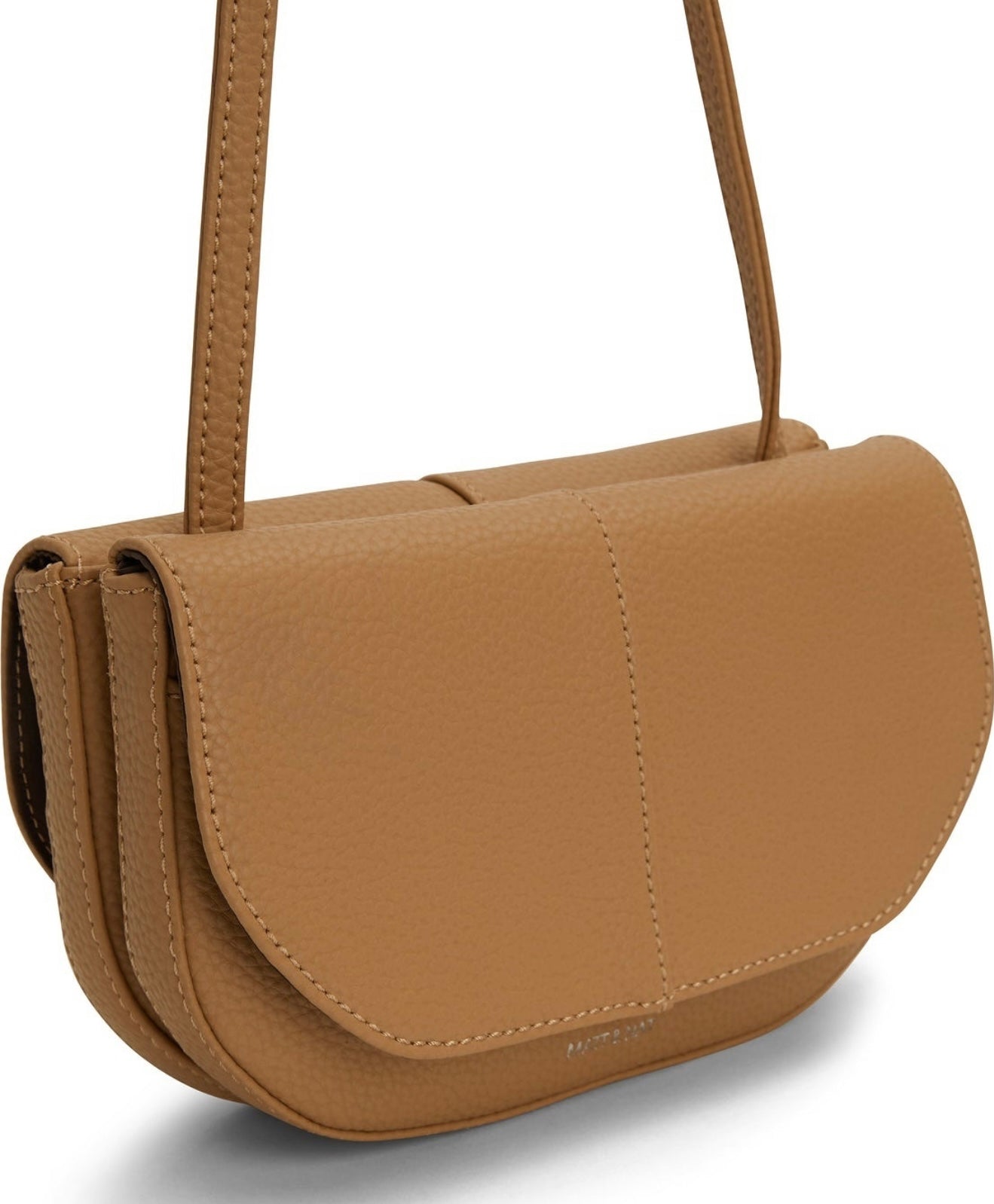 Crossbody bag with two compartments. Small slip pockets under front flap, 6 card slots and a slip pocket under back flap, and adjustable crossbody strap.