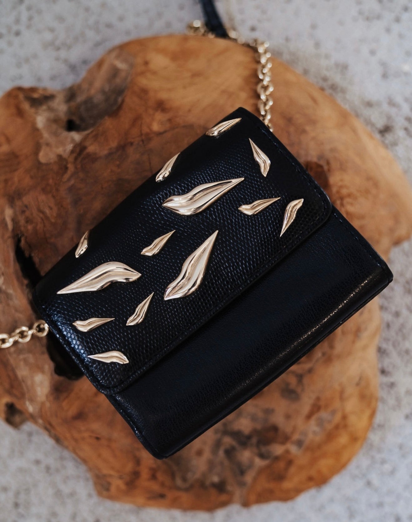 Black leather + gold hardware = lethal combo.