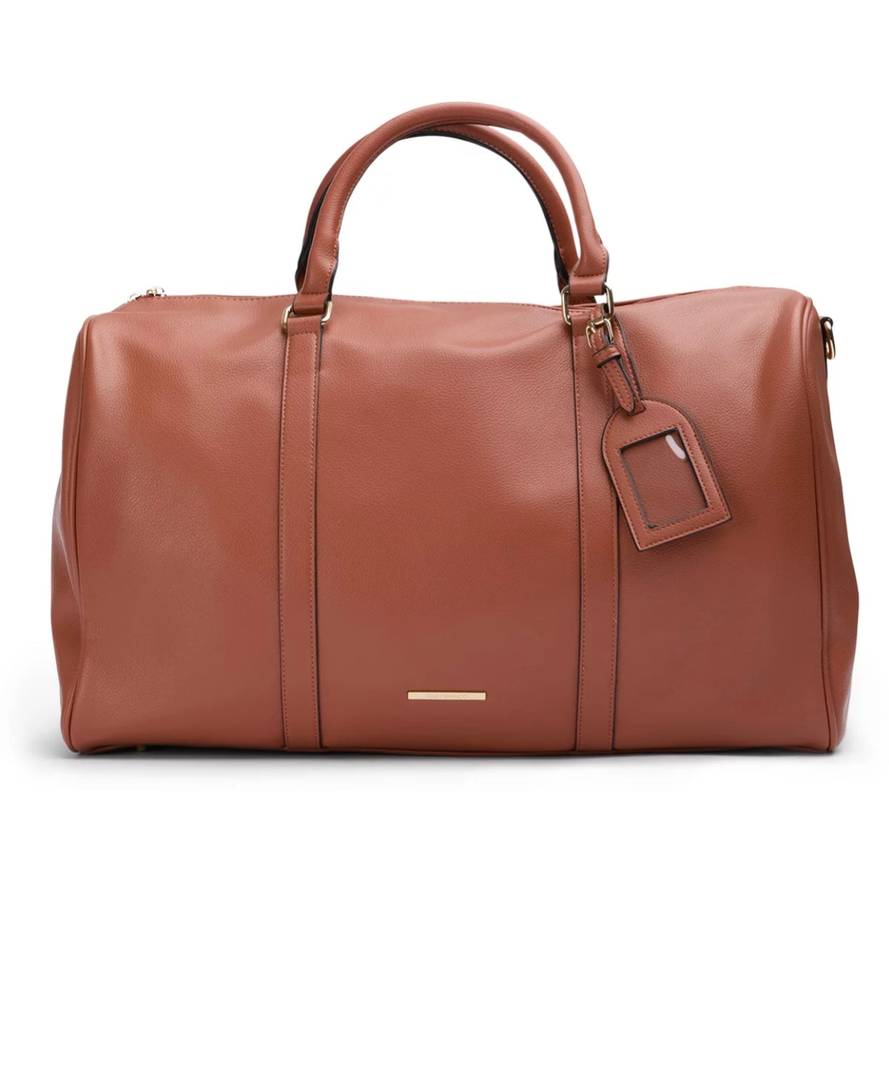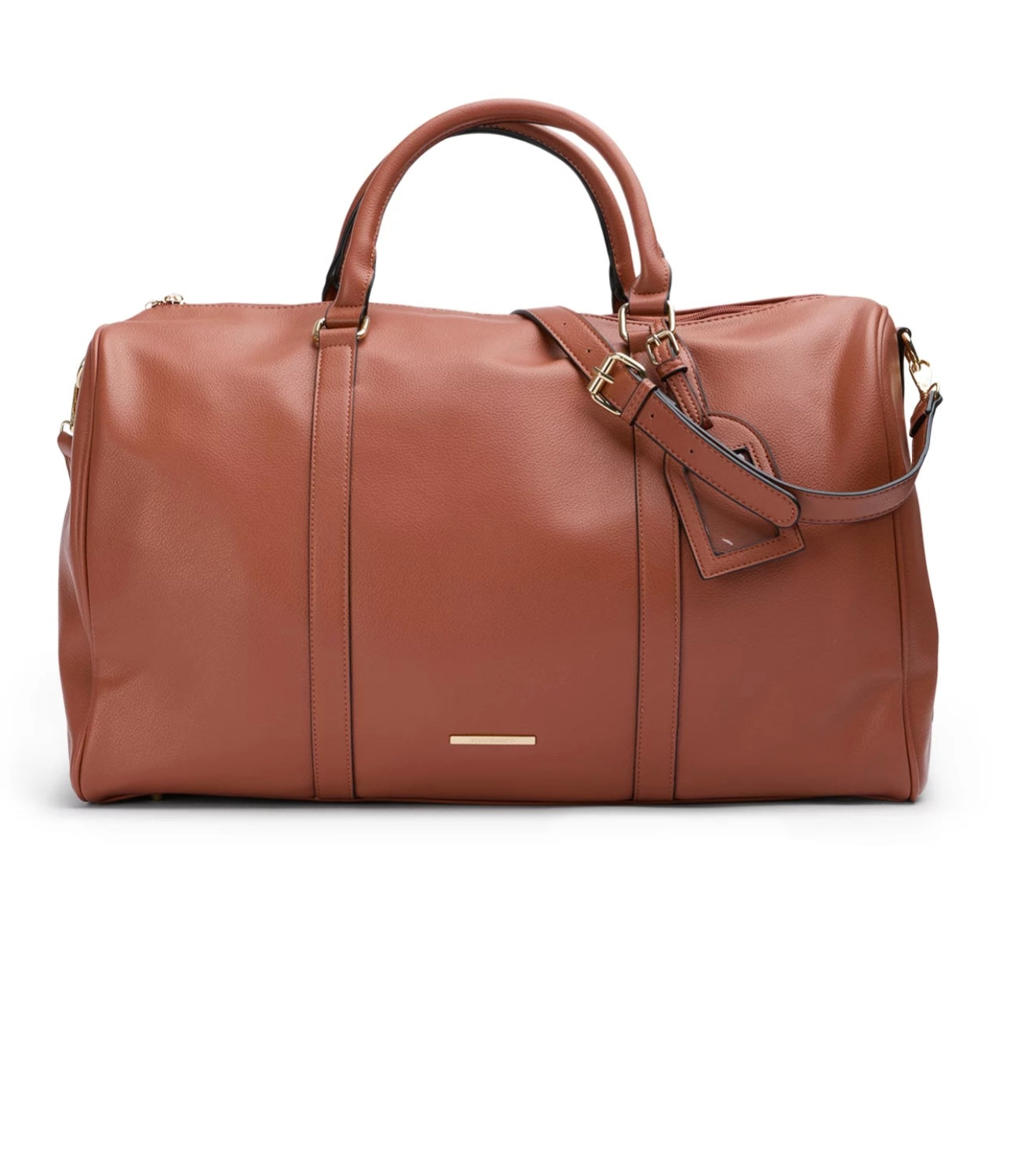 Crafted in luxe tan faux leather, this spacious carryall is perfect for weekends away, gym days, or overnight escapes.